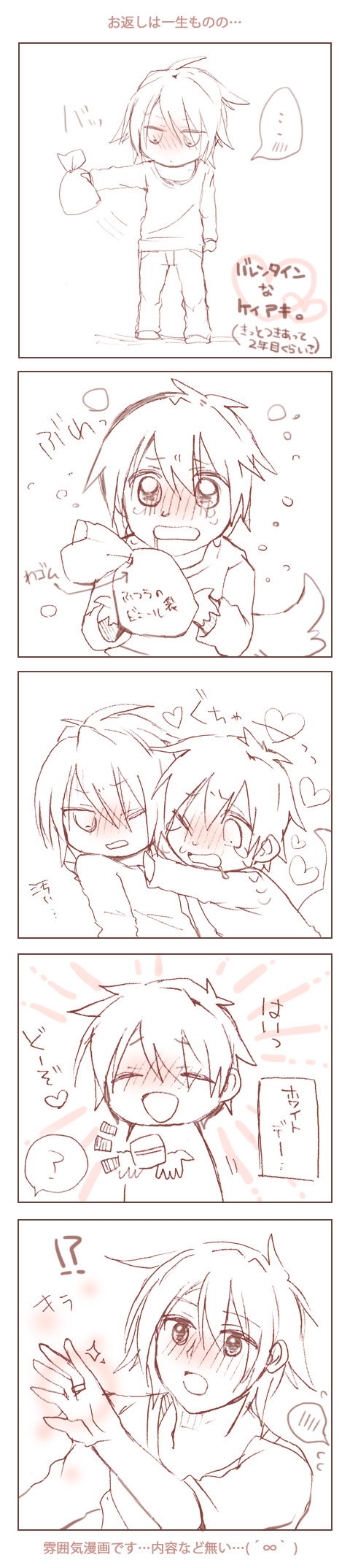 遅れすぎたらくがき…なんだか急にケイアキバレンタイン漫画描きたくなって描いたブツもう咎狗も9周年なんだってね!驚き…ケイアキは完全に夫婦だね 結婚9年目だね…すごい私の妄想としては、最初は一緒に働いてたケイアキだけどケイスケのために専業主婦になってるといいなアキラァ…家事に専念するお嫁さんなアキラァかわいいそのために一生懸命はたらくケイスケかっこいいそんな妄想をしながら日々を生きてる私です(´ρ`)